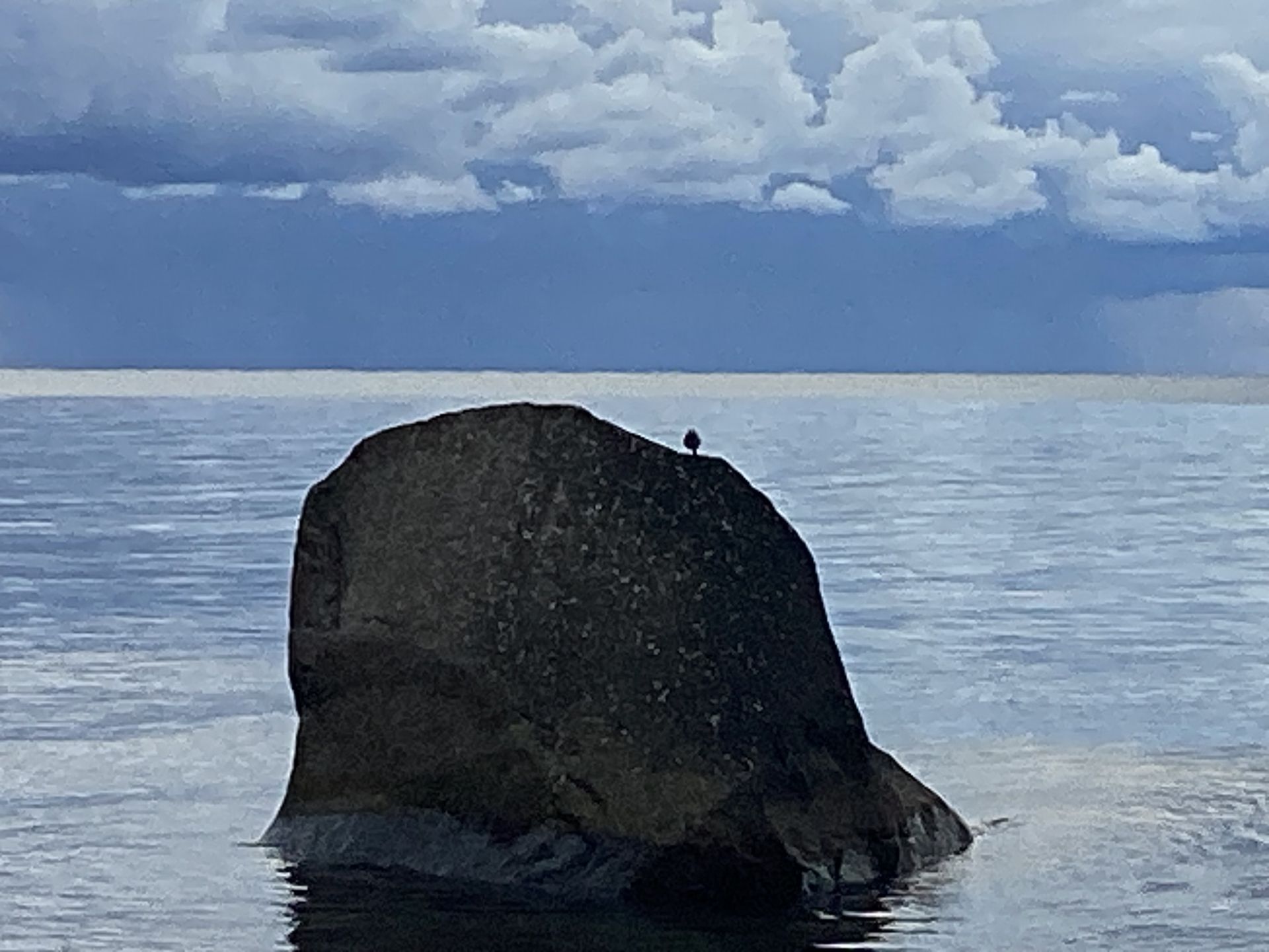 In der kleinen Bucht auf der Höhe des Eingangs zum Nationalpark ziehen die schweren Regen-wolken nur ganz langsam in Richtung Wasser. Auf einem Stein mit Kuhle finde ich Platz und atme mit der leicht bewegten Ostsee. Vor mir schwimmt ein einzelner Kormoran und taucht ab. Nach einer Weite vermute ich, dass ich ihn verloren habe, dass er längst weitergezogen ist. Jetzt taucht er auf und gleich wieder ab. Ich zähle: 21,22,23… 18 Sekunden bleibt er unter Wasser, kommt kurz hoch und taucht erneut. Wow, das ist beeindruckend und ich merke, wie er Neugierde in mir weckt.