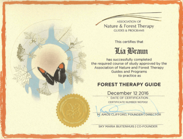 Lia ist seit 2016 die erste von der Association of Nature and Forest Therapy ausgebildete und zertifizierte "Forest Therapy Guide" in Deutschland. Zuvor absolvierte sie im Bereich Naturerleben und Naturverbindung Weiterbildungen zur zertifizierten Stadtnaturführerin in Berlin, in Systemischer Prozessgestaltung in der Natur, Wildnispädagogik und Permakultur.